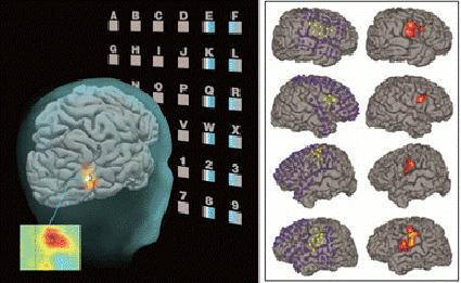 在病人眼前呈现的是一个隐藏着运动条纹的虚拟键盘,病人通过自己的视觉注意来选择想要输入的字符,被注意的字符会引起更强的神经活动。该项研究发现这种增强的神经活动主要表现为60赫兹以上的高频振荡,空间上集中于中颞叶一个很小的脑区,检测这一区域高频神经信号的能量变化就可以确定病人要输入的字符。功能磁共振扫描发现,该区域与处理视觉运动的脑区非常吻合。因为实验采用了巧妙的视觉运动设计,使得神经响应高度集中,可以通过功能磁共振精确定位。这项研究首次实现了通过神经影像精确定位的微创脑机接口技术,在国际上引起关注。