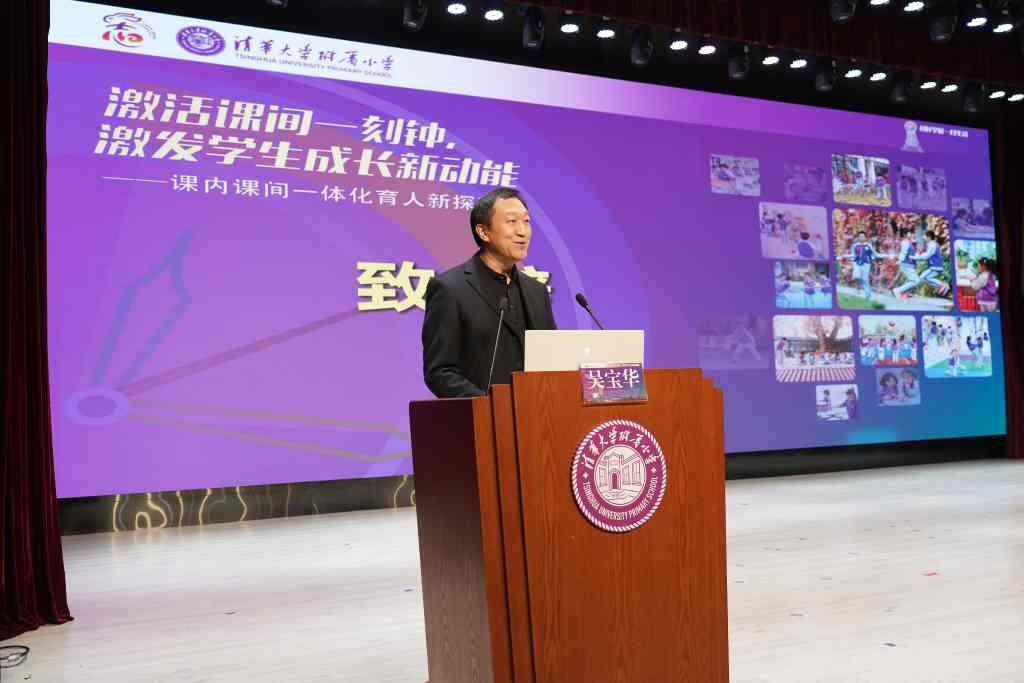 集中研讨环节,清华附小校长窦桂梅作题为“时间育人:过好学校一日生活——清华附小课间一刻钟育人实践创新”的主旨报告,介绍了清华附小秉承“儿童站立学校正中央”的教育哲学,在主题教学引领下,通过深化“1+X课程”体系,构建儿童一日学校生活育人体系,着眼学生六年的长期发展,以“课间一刻钟”小切口,做牵一发而动“学校一日生活”全身大文章,重塑儿童每日的健康、阳光、乐学的生命样态,促进学生德智体美劳全面发展的实践与思考。