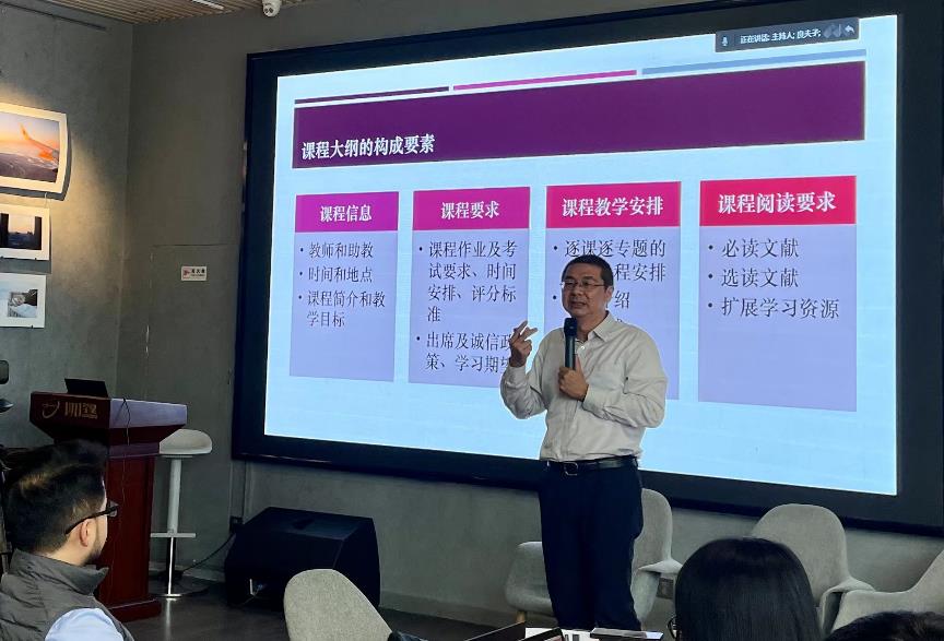 何建宇围绕“如何设计一份高标准的课程大纲”介绍了设计准备通识课的全过程。他表示,课程大纲既是老师的教学指南,也是学生的学习指南和知识地图。何建宇结合通识荣誉课“中国政府与政治”的教学实践分享了课程大纲的构成要素和“以学中心”的通识课设计。课程大纲的设计实质上体现了课程的建设思路,应当与教学目标、课程逻辑设计,专题设计的细化、材料的挑选等紧密相连。