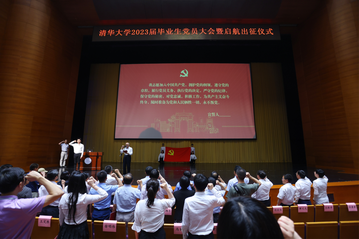 邱勇向赴西部、基层、部队、高校和重点单位工作的毕业生代表授旗。在倪维斗院士的领誓下,全体党员一起重温了入党誓词。