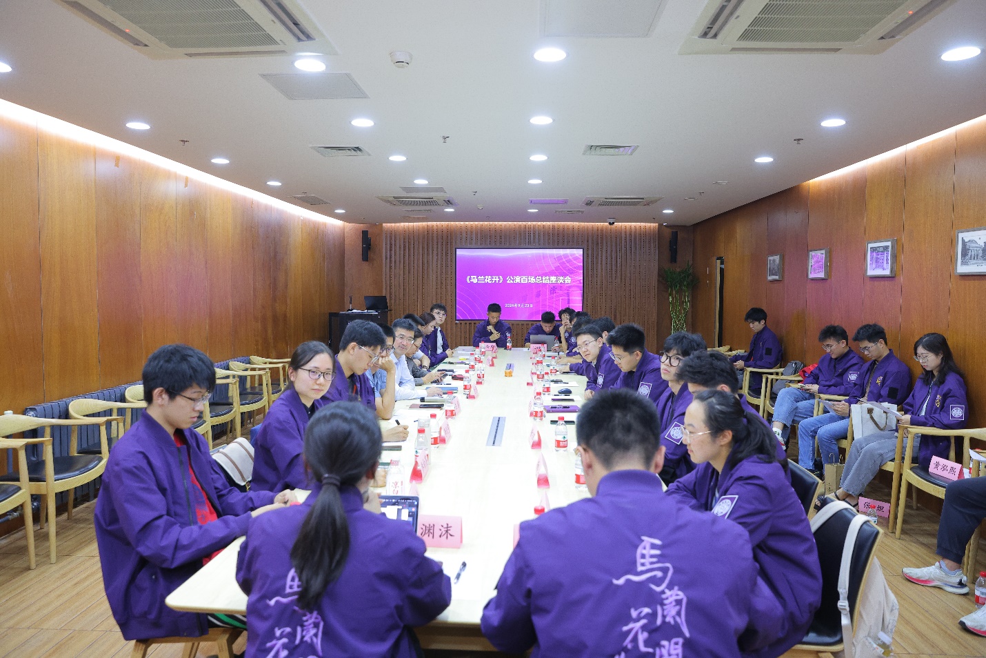 核研院2023级硕士生于鸿飞、公管学院2023级博士生刘宇尘等组织保障同学,法学院2024级博士生陈子晗(饰邓稼先)、生命学院2024级博士生杨晓征(饰邓以蛰)、美术学院2024级硕士生杨罗锋(饰小高)、化工系2024级硕士生杨宗郁(饰小张)、航院2023级本科生陈秀虎(饰实验员)、航院2022级本科生孟鼎杰(景片演员)、日新书院2021级本科生乐宸旸(舞蹈演员)等演员,以及新闻学院2023级硕士生张渊沫(舞台监督)、笃实书院2024级本科生李芷嫣(道具工作人员)等技术台口同学交流发言,分享了自己亲身参与《马兰花开》第100场公演的经历、成长与感悟。同学们纷纷表示要继续演绎好邓稼先学长的事迹,让马兰花绽放在校园内外,盛开在更多人的心里。