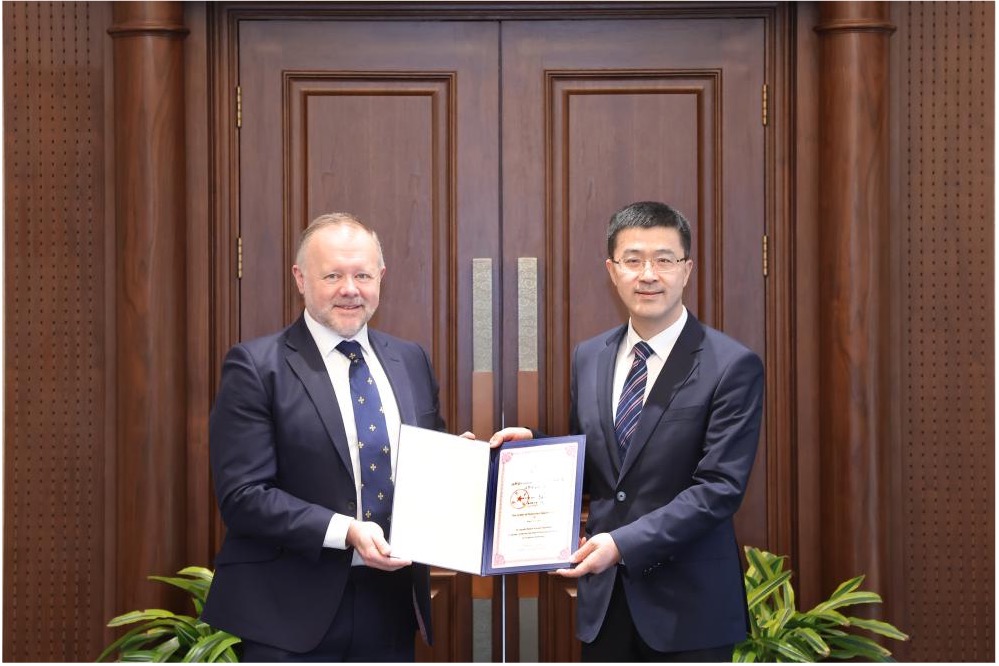 过勇为加里斯·斯坦斯菲尔德颁发名誉教授聘书。乐竞官方端网站登录入口国际与地区研究院院长姜景奎主持聘任仪式。