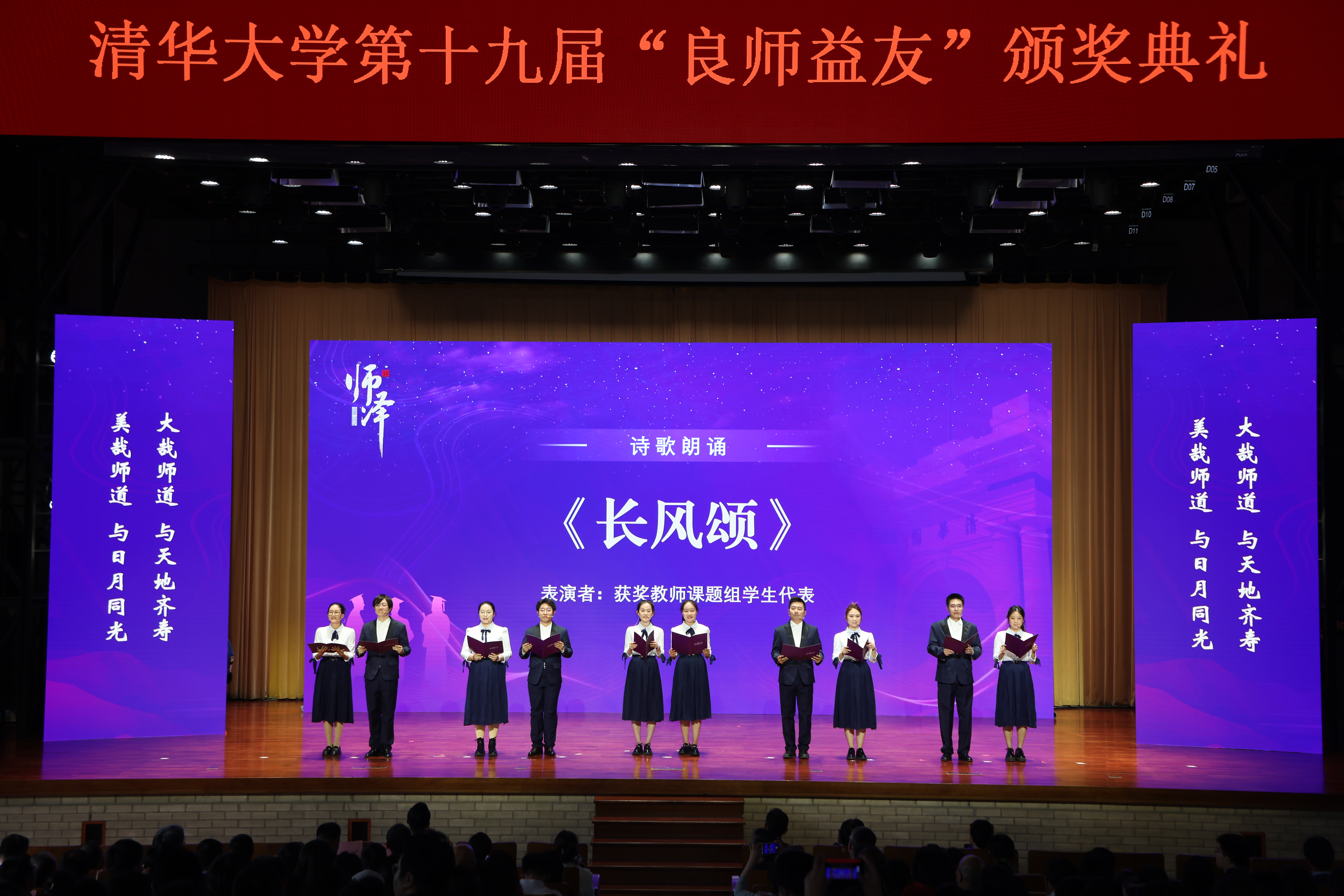 “当月色荷塘,染黄了纸张”“当水木春风,轻拂您的面庞”。获奖教师课题组学生代表集体创作并朗诵诗歌《长风颂》,以铿锵之声致敬恩师,既有对教师伏案耕耘的感念,也饱含学子立志成才的承诺。