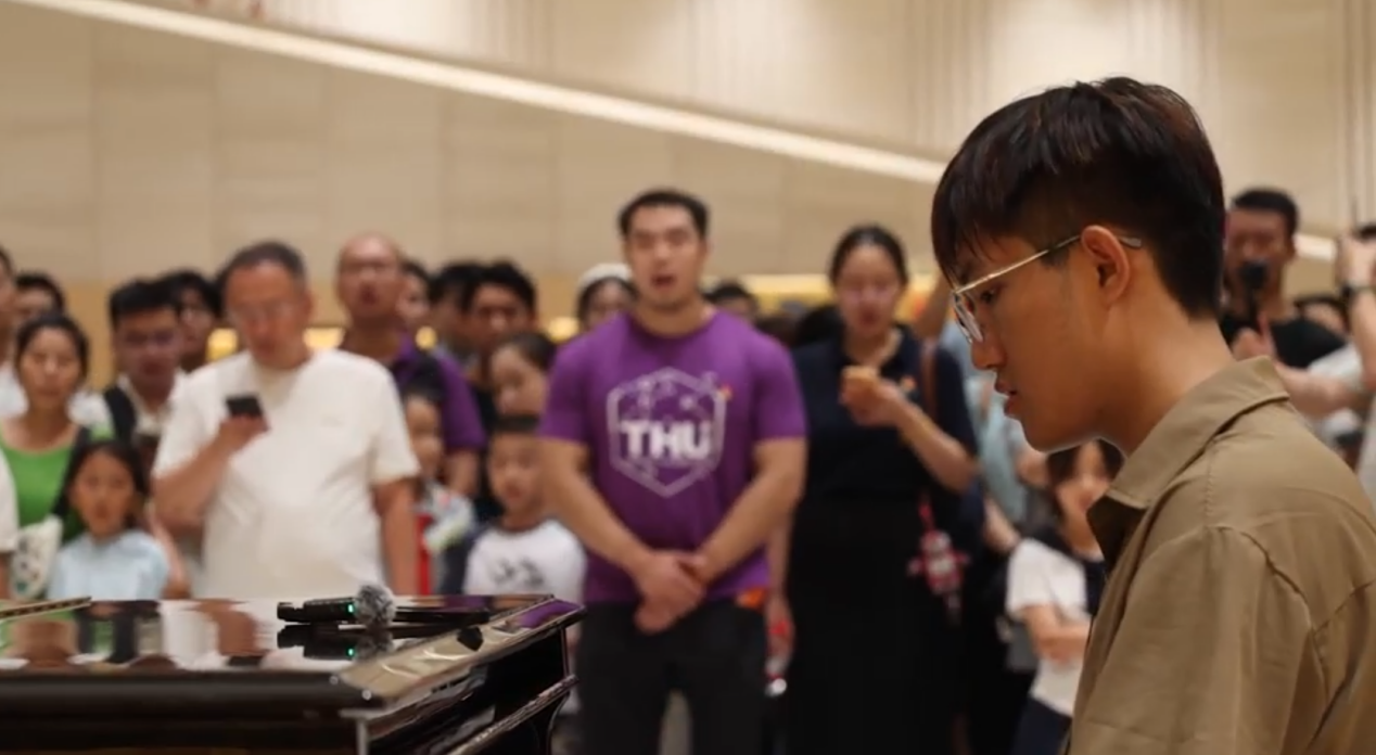 在中国人民抗日战争纪念馆,激昂的琴声与低声的清唱融为一体,现场参观的人群驻足围观。《国际歌》《我和我的祖国》《保卫黄河》……工物系2023级本科生张誉泷在参观结束后即兴演奏钢琴曲,用一个个指尖流动的音符唤起参观者深沉的民族记忆。