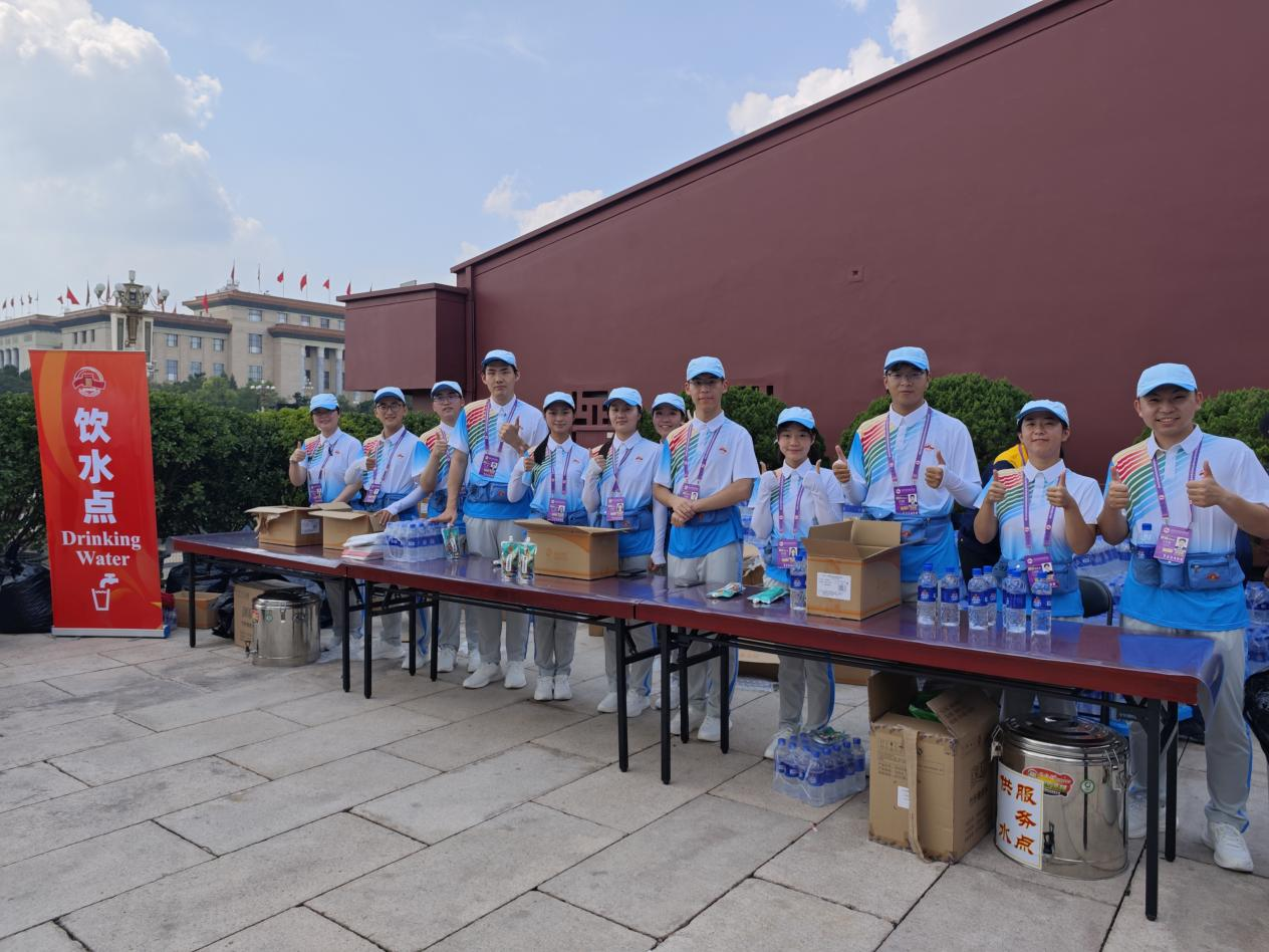 卫健学院2024级博士生闫温馨曾参与新中国成立70周年、庆祝中国共产党成立100周年等重大活动,他这次主要负责观众饮水点的服务工作。令他尤为难忘的是,一次夜间综合演练中突然下起大雨,但大家自始至终坚守岗位,以饱满的热情和专业的态度做好服务保障,毫无怨言。闫温馨感慨,参与志愿服务期间,自己不仅锤炼了意志,更收获了一份深厚的友情。