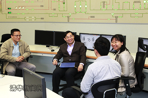 图为胡和平与高温气冷堆核电站示范工程模拟控制室青年教师进行交流。记者 郭海军 摄