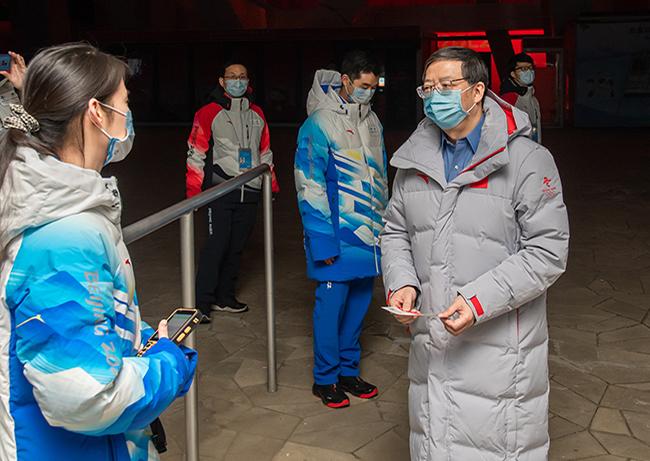 邱勇一行先后来到贵宾休息区、观众验票口、志愿者之家。在听取志愿者们逐一自我介绍并分享参与志愿服务的切身体会后,邱勇对志愿者们积极备战冬奥的良好精神面貌给予高度肯定。