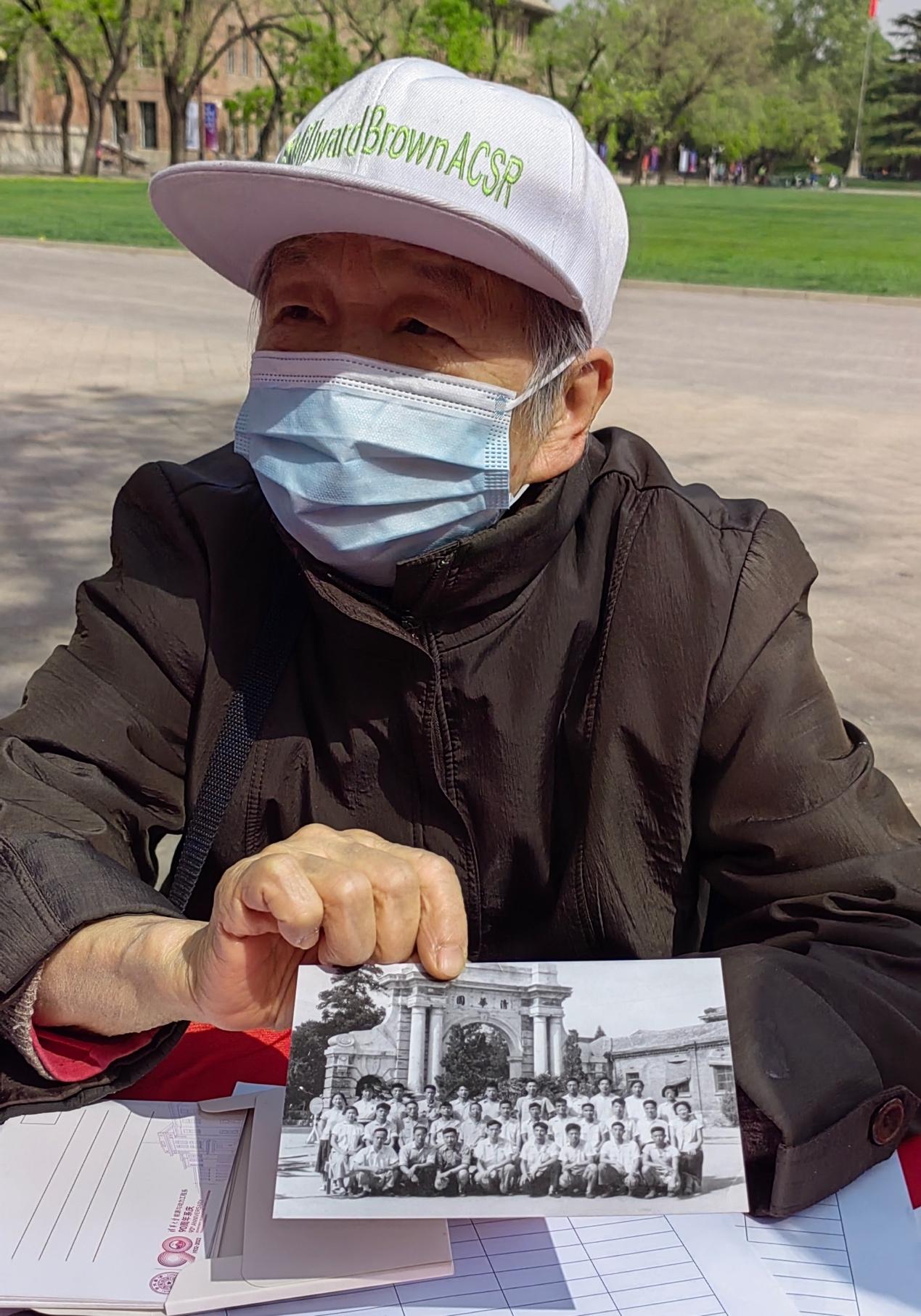 1954级的校友周礼蔚手捧当年的毕业照回到母校