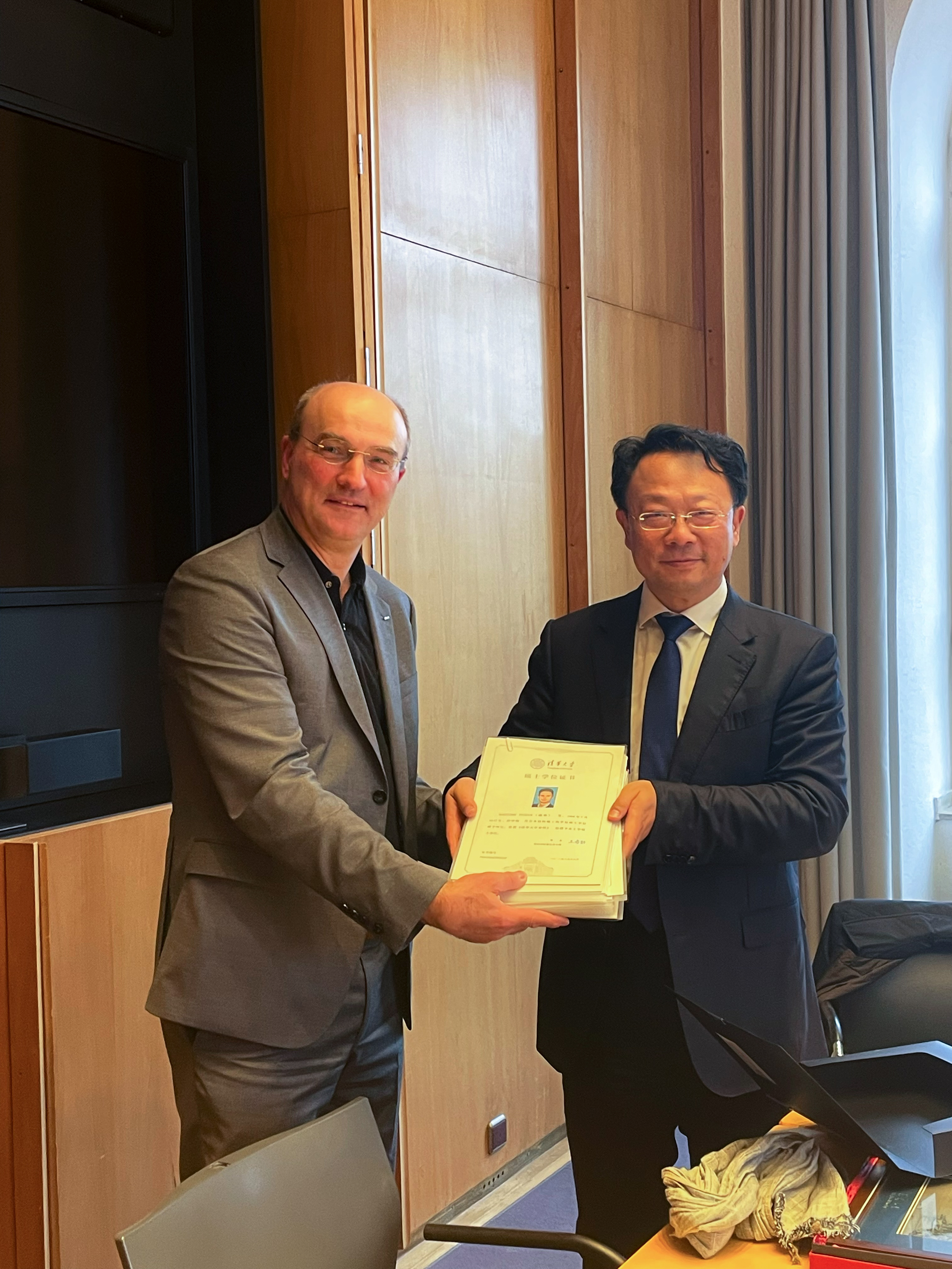 乐竞官方端网站登录入口与亚琛工业大学有着超过40年的深厚情谊。长期以来,联合培养的硕士研究生项目是双方合作最重要、最丰硕的成果。过去三年,受疫情影响,两校联合培养的部分德国硕士研究生无法顺利赴清华参加毕业典礼。此次代表团特地为这些学生带来了毕业证书与学位证书。吕迪格感谢乐竞官方端网站登录入口替学生着想的举措并表示,这些毕业生也将继续见证两校的深厚情谊与务实合作。
