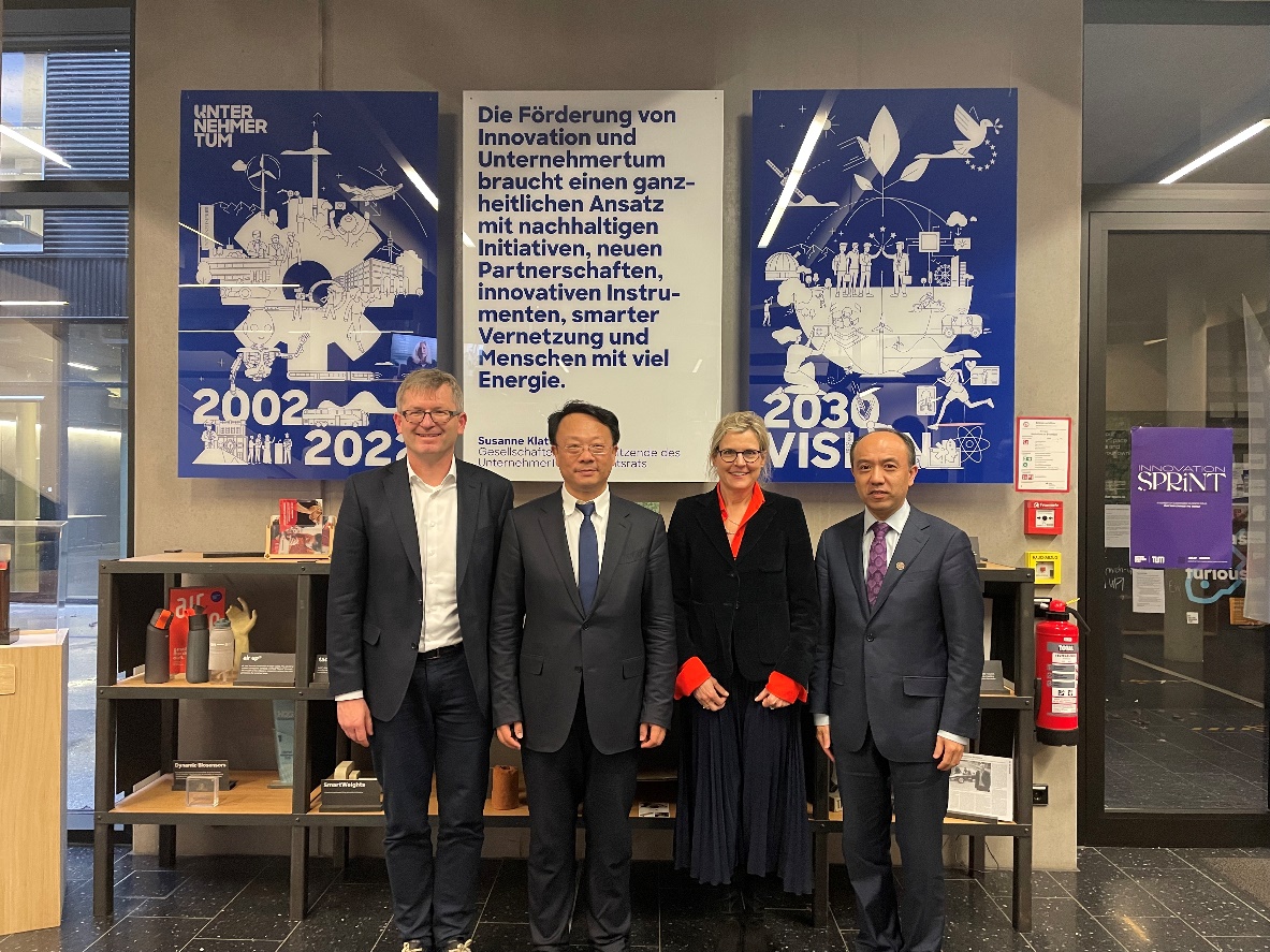 在加兴校区,王希勤一行与慕工大能源与信息研究中心主任托马斯·哈马彻(Thomas Hamacher),计算机学院机器人、人工智能与实时系统研究所所长唐逸儒(Alois Knoll)等学科带头人进行座谈。随后,代表团在副校长赫尔穆特·舒宁博格(Helmut Schonenberger)的陪同下参观了慕工大创新创业中心,会见创新中心相关负责人,并听取青年创业者们的优秀案例分享。