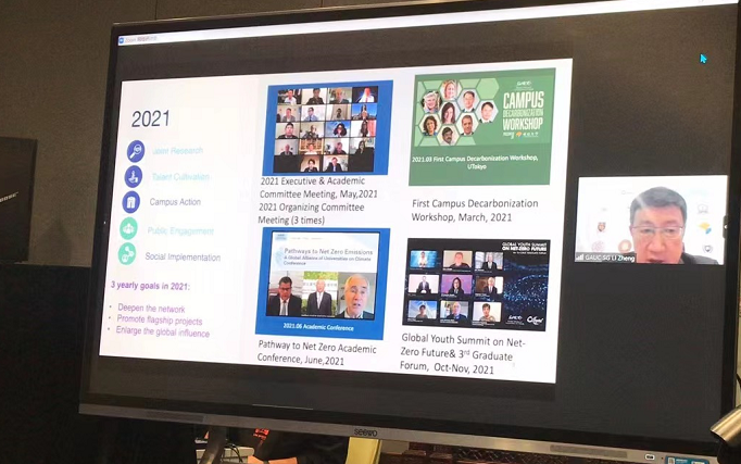 在年度工作报告环节,李政围绕联盟2021年工作进展及2022年工作展望进行了汇报。截至2021年11月,联盟秘书处已圆满完成包括深化盟校网络、打造旗舰项目及提升全球影响力在内的年度工作目标。在深化盟校网络方面,2021年联盟秘书处任命了执行秘书长,组织召开了执行委员会、学术委员会和组织委员会会议;在旗舰项目方面,秘书处成功协助东京大学组织了“零碳校园工作坊”,协助伦敦政经学院组织了“净零路径学术研讨会”,并在格拉斯哥发布联盟旗舰报告;在提升全球影响力方面,秘书处结合全球气候治理进程的新形势,提议将已成功举办两届的研究生论坛升级为全球青年零碳未来峰会,得到盟校的一致支持,15所盟校联手呈现30场活动,吸引全球500余名青年提交作品,超过125万人次以多种形式参与,全球媒体报道触及人群达560万人次,多位全球气候治理领域国际知名人士表示肯定与赞赏。