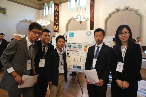 2013年10月,在参加完英特尔全球挑战赛后,陈家轲(右二)的学生创业团队与带队教师、清华x-lab主任张帏(左三)合影。