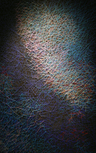 谈到个人创作,岳嵩说,他的纤维艺术作品,除尝试运用棉、丝、麻、毛、藤等天然材料,亦有现代技术手段研发的新型纤维媒材,如热熔化纤材料等。他的作品风格面貌大相迥异,气质语言也因材料的变化而各成一体。材料的运用是他在纤维创作中最着意的地方,似乎他的天赋才情也在这里挥洒得最为自如。