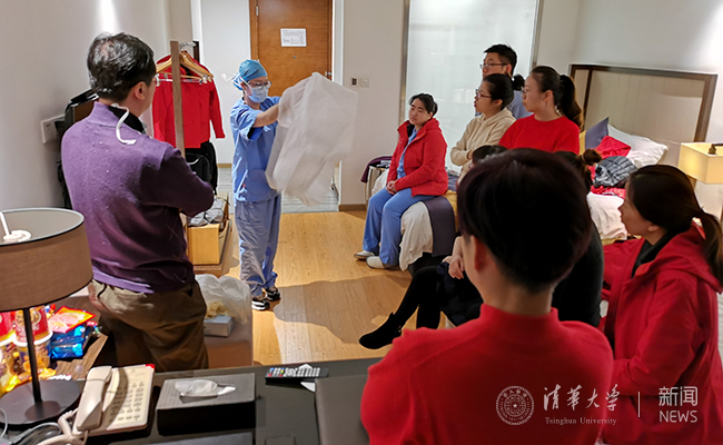 医疗队成员一起讨论如何更好地使用防护装备