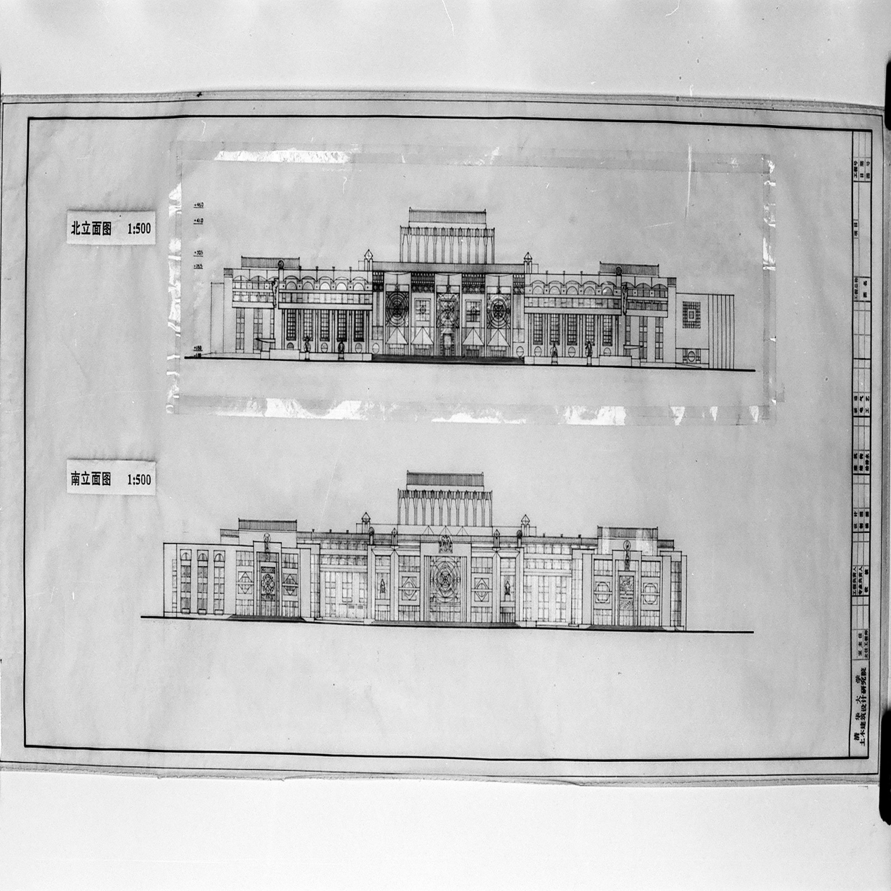 画图是建筑的基本功,学生们都知道李先生做设计、画图即好又快,是一位身怀绝技的“高人”。天桥剧场地处闹市,且地段狭窄,如何将复杂的功能和空间安排妥当?李道增将方案草图绘制得非常细致,将半透明的草图纸覆盖在有网格的坐标纸或底图上进行工作。多数草图都是用尺规完成,有铅笔线条也有墨水线条,修改之处的痕迹明显,或者用涂改液覆盖后再画,甚至局部粘上另外一张纸继续画。