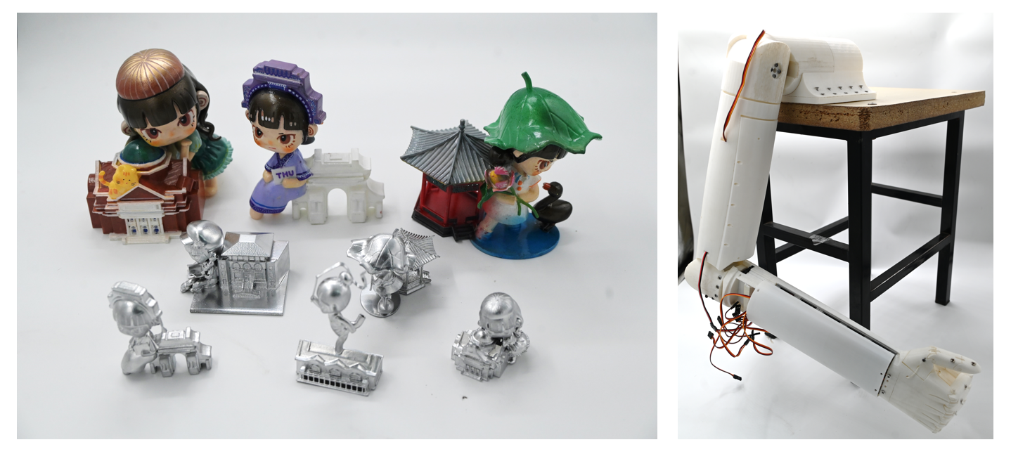 外观设计赛道获奖作品“走进清华”系列文创盲盒(左)、机械设计赛道获奖作品First机械手(右)