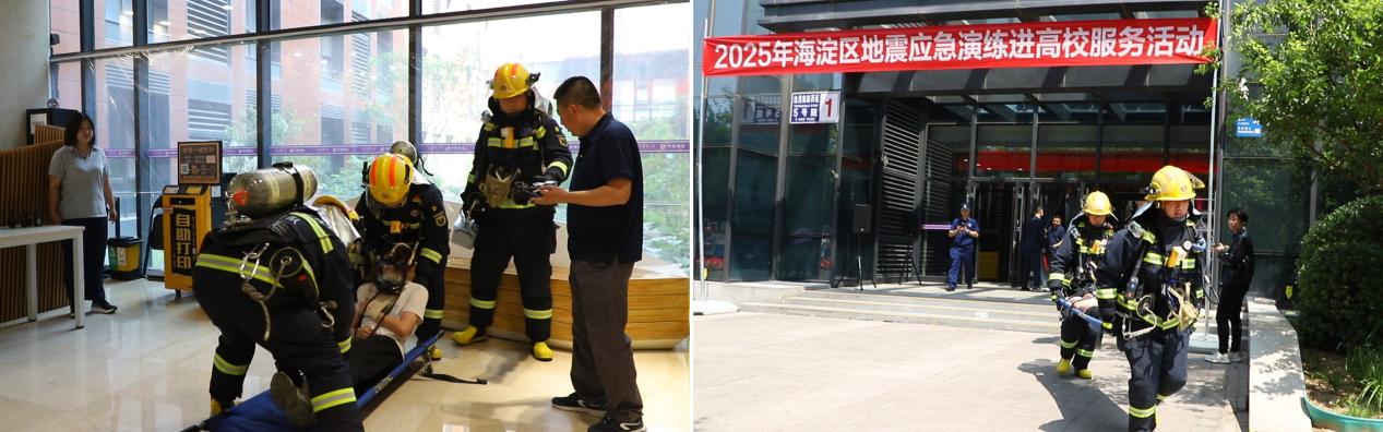 演练中模拟有人员受伤,海淀区八家消防救援站派人及时赶到现场救助伤员。疏散组迅速清点人数,依次发放救灾物资。