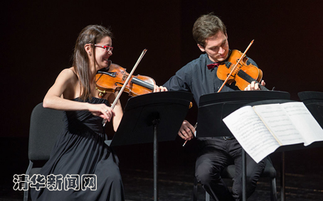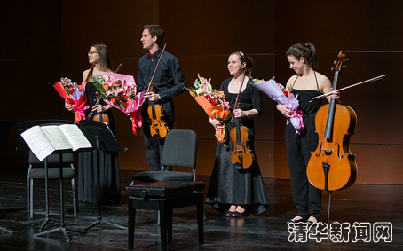 演奏中,这4位年轻的音乐家,凭借其娴熟的演奏技艺、充满朝气同时稳健的表现力以及演奏家之间独特的对话与默契,给清华的观众带来了一场听觉的饕餮盛宴。悠扬的行板、活泼的快板、兴奋的急板……灵动的提琴声时而俏皮欢快,时而低沉苦涩,带领着观众领略古典弦乐的别致魅力。同时,四位音乐家在琴弦上跳跃的手指,随乐曲摆动的身姿,投入的表情以及队友之间挑眉、微笑与眨眼的互动,都给演出增添了活泼与张力。