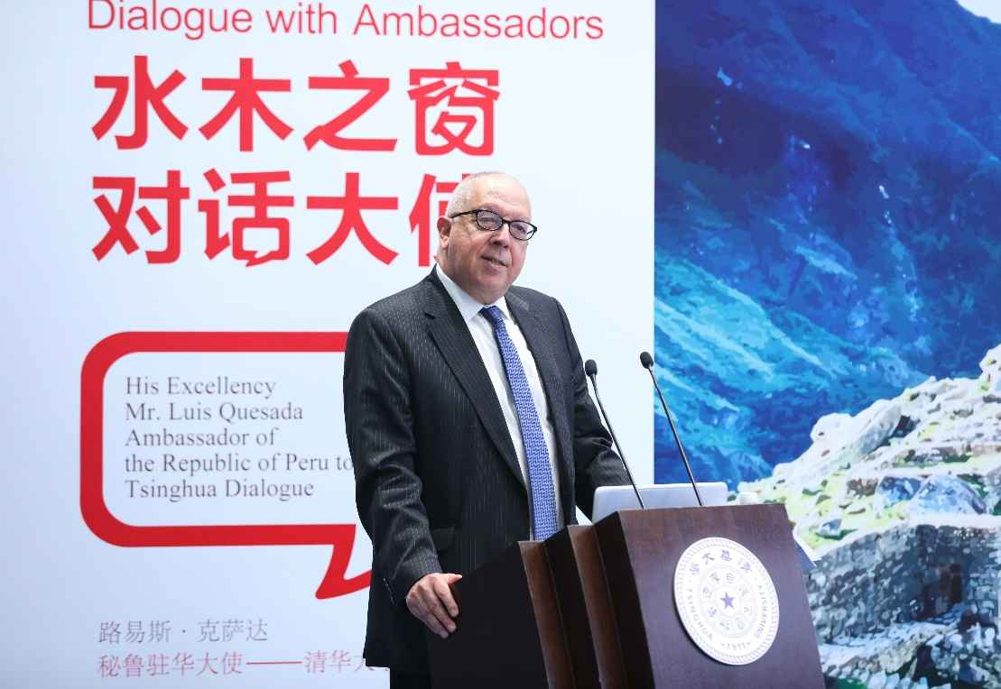 克萨达大使首先向清华学子介绍了秘鲁概况,同时回顾了秘鲁与中华文明的历史渊源,以及两国建交五十年来的友好合作历史。2013年,中秘建立全面战略伙伴关系以来,双方不断深化互信,拓展合作,连续多年保持秘鲁第一大贸易伙伴地位。今年是中国与秘鲁建交50周年、秘鲁独立200周年,他希望未来继续扩大两国合作,开展更加多元、更有成效的合作。