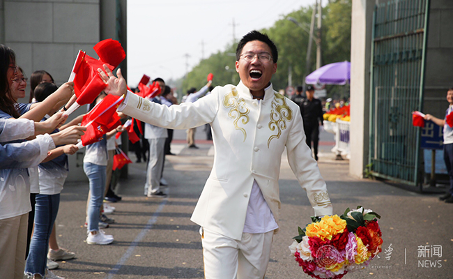参加游行的同学手舞花束回到校园