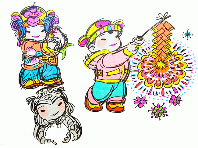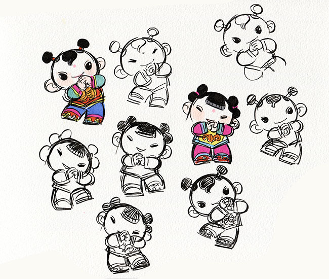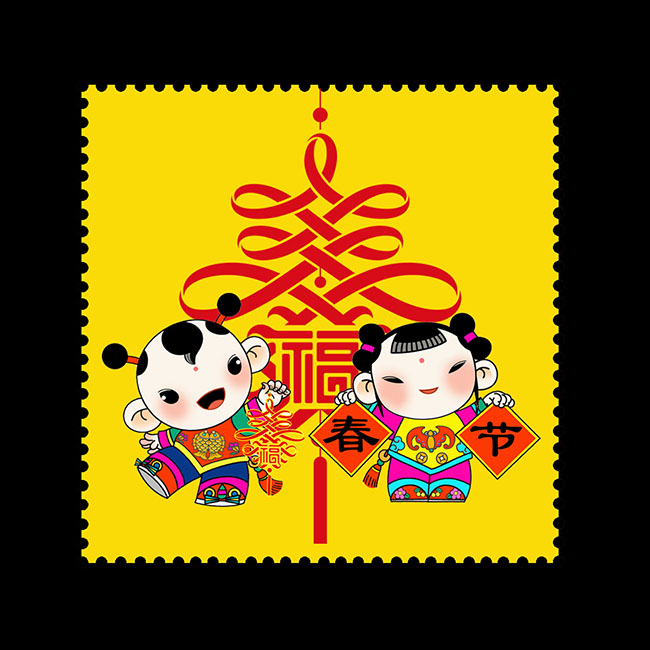 吴冠英教授表示,在设计上以一对身着民间传统服饰的男、女娃娃,双手做拜年的姿态,表达春节的特定内涵。同时围绕这一重要传统节日丰富多彩的节庆活动,做了部分延展的设计。