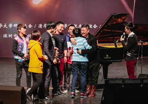 韩磊与上台演唱的校园歌手互动。