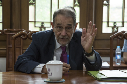 图为欧盟前共同外交与安全政策高级代表索拉纳与学生交流。