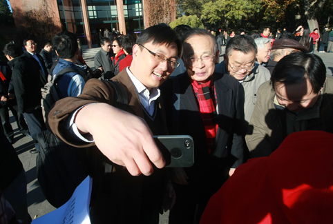 工物系1954级校友、北京外国语大学原党委书记曹小先(女)与谭浩强等校友交谈。
