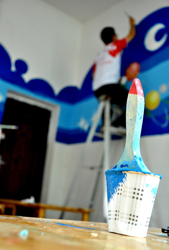 图为赴重庆彭水县“优化校园,粉刷梦想”支队的队员工作中。