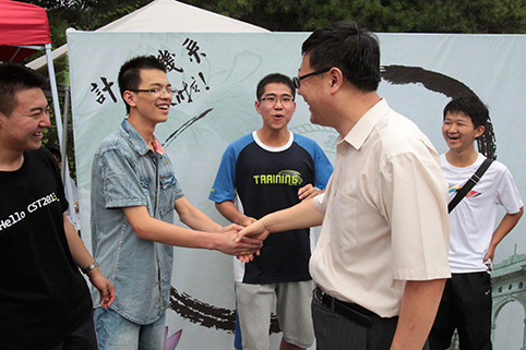 校长陈吉宁与新生握手。记者 郭海军 摄