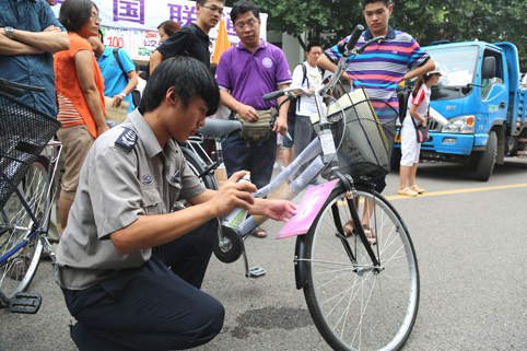为新生的自行车喷上学号。记者 苑洁 摄