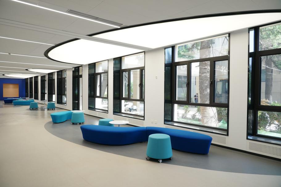 细节上,字牌、墙面和灯光的设计,都体现了建筑空间的一体化。三段与一段的教室门牌字体一个如盒子方正,一个由折线贯通;地毯也分别呈方形和线形,与椭圆形、钻石形的灯光相映成趣。