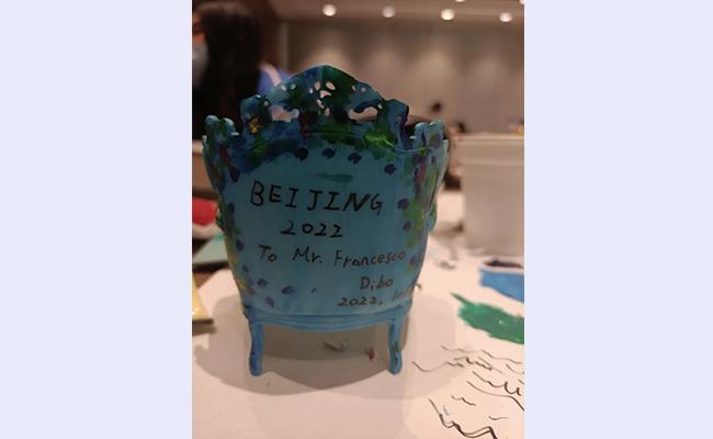 在本次冬奥期间,志愿者刘迪波与夏季奥林匹克项目国际单项体育联合会总会(ASOIF)主席弗朗西斯科(Francesco)先生结下了深厚的友谊。在弗朗西斯科先生离开北京前,刘迪波想送他一份特别的礼物。刘迪波想起自己随身带了一些清华艺术博物馆3D打印的白模,其中有个椅子模型正是意大利著名设计师门迪尼的作品,“如果我在椅子上点缀一些冬奥元素,这不就正是一位意大利老爷爷与北京冬奥会相识相遇的故事吗?”刘迪波从没学过绘画,他花了一整个下午的时间,用自带的丙烯颜料为椅子涂色,并特意在上面加上了北京冬奥会的标识和落款。