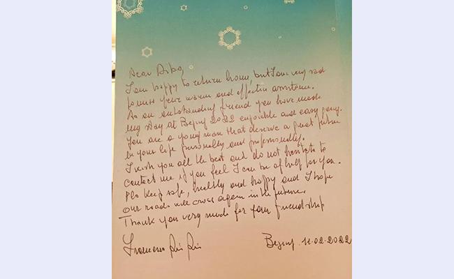 里奇·比蒂老爷爷赠给迪波一本冬奥开幕式的节目单,而当刘迪波翻开这份节目单,他发现了老爷爷藏在其中的一封诚挚的感谢信:“你是一位优秀的朋友,让我的北京之旅舒适轻松。你是一个值得拥有美好未来的年轻人。下次再来欧洲,请记得联系我。不仅2026相见,2032的布里斯班也要相见!”