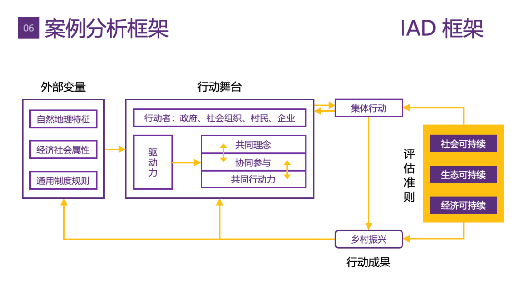 最终,案例团队在理论分析中,通过运用制度分析与发展(IAD)框架,融合了乡村振兴、协同治理和集体行动三组理论,提出了分析框架,从理论上探讨经济发达城市周边乡村的振兴机制,揭示了发展到成熟后现代社会阶段乡村衰败的困境、成因和重振乡村的路径和经验,为中国和世界范围乡村振兴提供启示和参考。