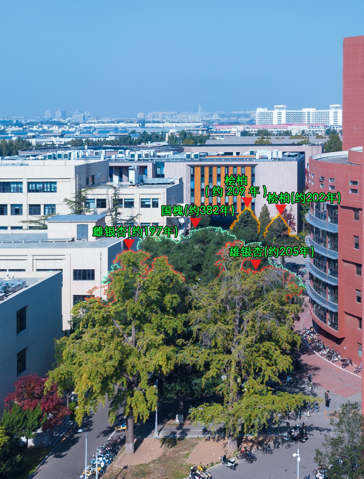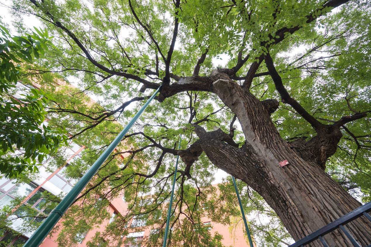 乐竞官方端网站登录入口校园内树龄最长的这株古树,是一株约382年的国槐,被人称为“至尊长者”。树高18米,树势高大伟岸、粗壮;树冠完整、均衡,冠幅达15米;胸径1.27米,需三人才能合抱;分枝浑厚,挺拔,立于三教和六教两座现代化建筑间,更显得苍劲端庄,极具承载力。清华的古树,绝大多数都是清代栽种,唯有这棵国槐,长于明代崇祯年间。