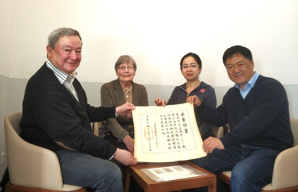 档案馆李运峰(右一)、校史馆冯茵(右二)专程赴德国征集李忍涛烈士毕业证书,左为李忍涛之子李定国和夫人