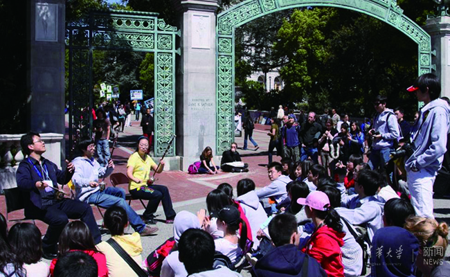 清华学生艺术团在伯克利加州大学门前演出。