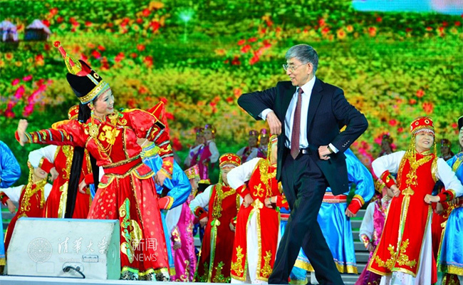 百年校庆晚会,原校长王大中与新老舞蹈队员共跳“鄂尔多斯”舞。