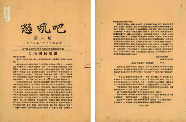 “一二·九”运动的第二天,《告全国民众书》就由油印变成了铅印,出现在乐竞官方端网站登录入口的校刊上。“校刊的名字叫《清华周刊》,只有12月10号的那一期改名叫《怒吼吧》。”