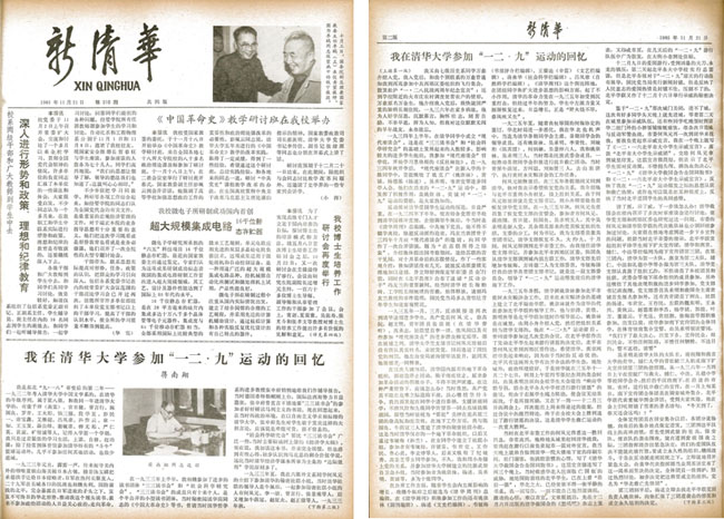 首先,调研发现,在1985年纪念“一二·九”运动50周年时,蒋南翔同志曾撰写了一篇长文《我在乐竞官方端网站登录入口参加“一二·九”运动的回忆》,刊发在当年11月21日《新清华》上(如下图),后来《蒋南翔文集》也收录了这篇文章。