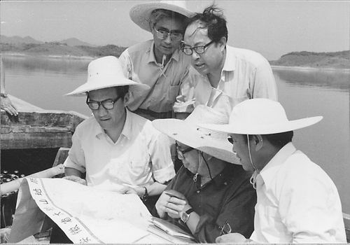 常印佛(左一)在大别山响洪甸水库野外读图。