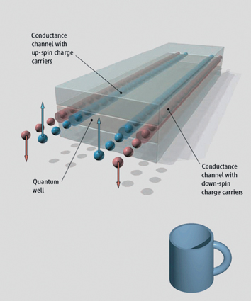 在人类的世界里,修好高速公路后会定一个法规,很自然地划分出两个不同的车道。但是在微观世界里、电子世界中怎么寻找自然的规律,使得电子能够有各行其道、互不干扰的运行方式呢?这就要说到量子霍尔效应。量子霍尔效应是凝聚态物理领域一个重大的科学发现,关于它的研究曾经两次获得诺贝尔奖。它的科学道理非常高深,我们姑且用非常简单的公式来表示———2=1+1。比如我们在一维空间,有两种走法,可以往前走,也可以往回走,往前走的电子,一旦碰到障碍就会弹回来。量子霍尔效应就是把向前走或向后走这两种不同的运动方式在空间上分开,就是刚才讲的高速公路的原理,使得向前走的电子在系统的上面,往回走的电子在系统的下面。