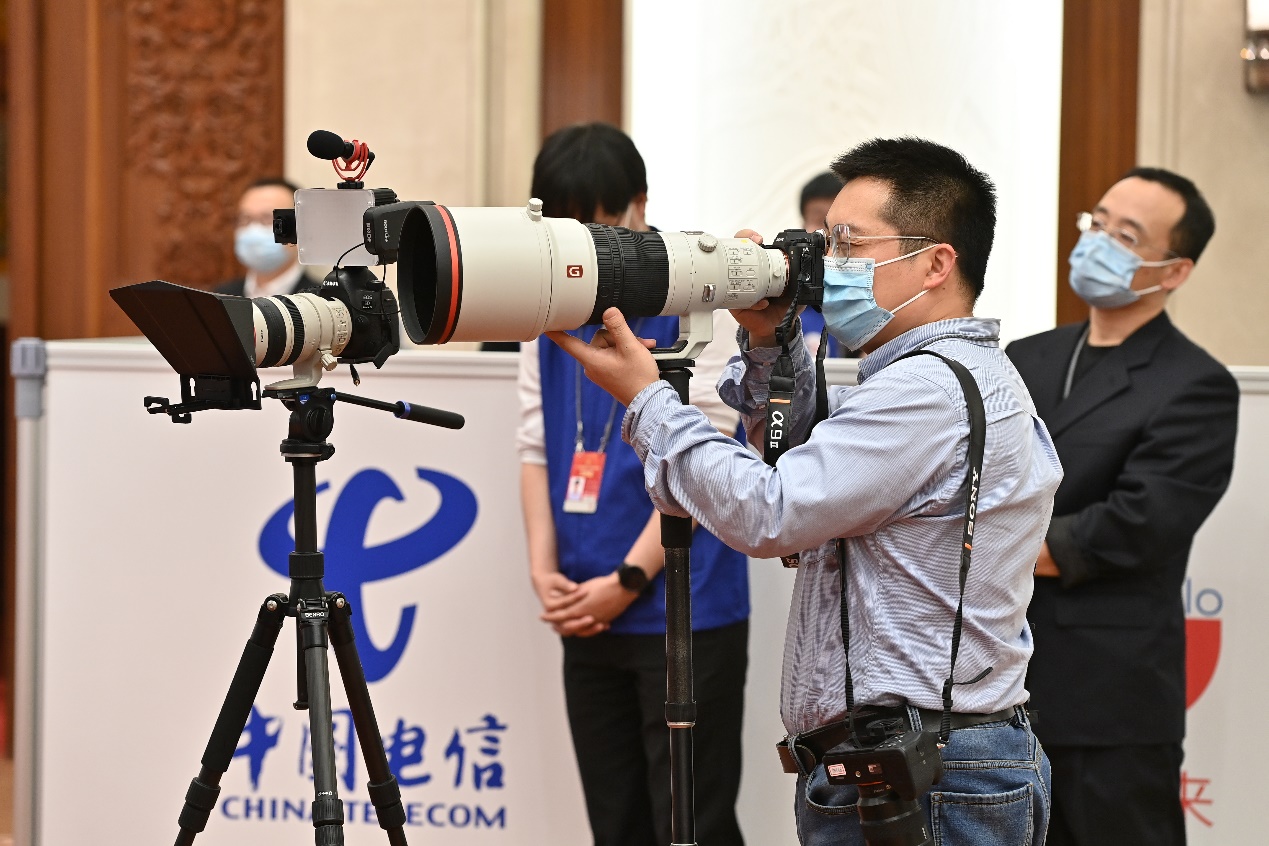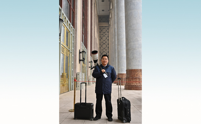2021年两会期间,邢广利在人民大会堂门口的工作照