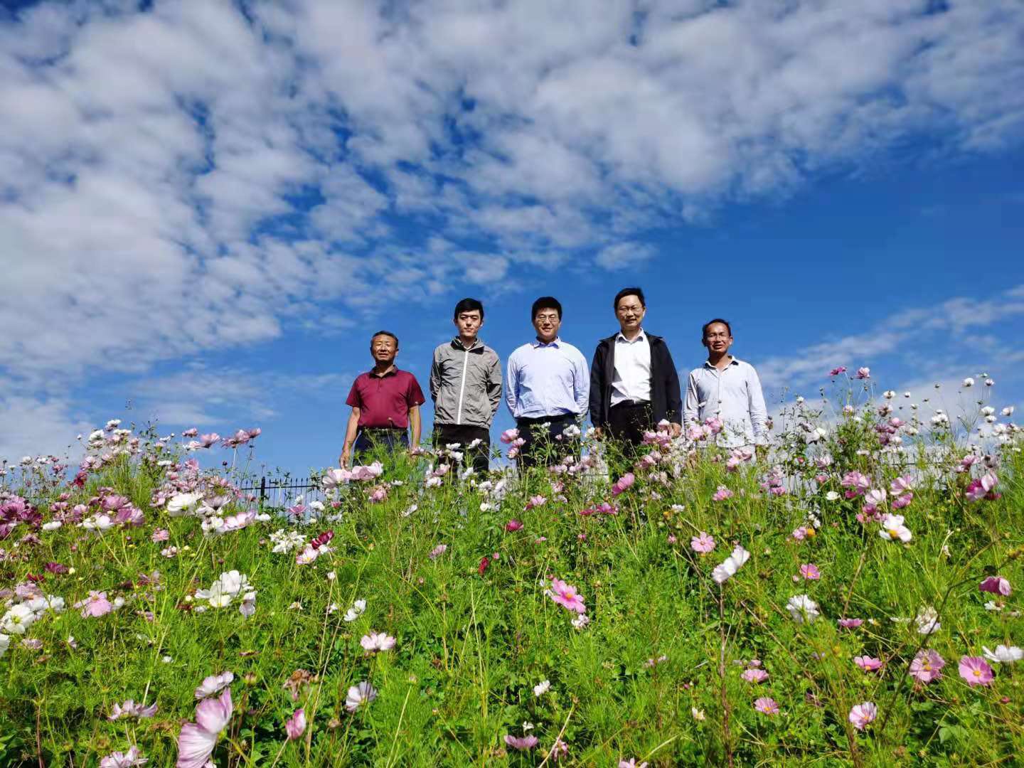 张开迪(右二)和同事在崀峨村格桑花海公园合影