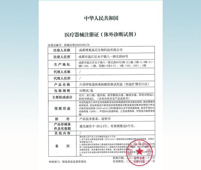 六项呼吸道病毒核酸检测试剂盒(恒温扩增芯片法)国械注准:20203400178