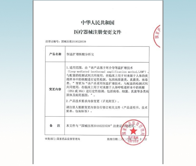 配套检测仪器“恒温扩增微流控芯片核酸分析仪” 国械注准:2017340354