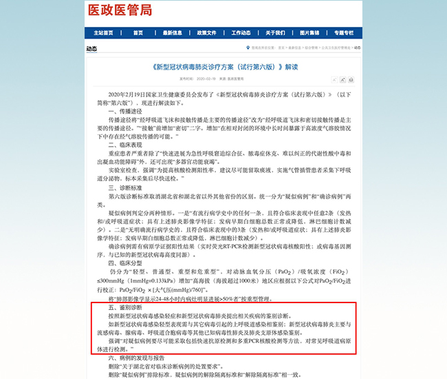 2月19日,国家卫健委办公厅正式向各地卫健委下发《新型冠状病毒肺炎诊疗方案(试行第六版)》。对于新冠肺炎的鉴别诊断,明确提出:“按照新型冠状病毒感染轻症和新型冠状病毒肺炎提出相关疾病的鉴别诊断。如新型冠状病毒感染轻型表现需与其他病毒引起的上呼吸道感染相鉴别;新型冠状病毒肺炎主要与流感病毒、腺病毒、呼吸道合胞病毒等其他已知病毒性肺炎及肺炎支原体感染鉴别。”