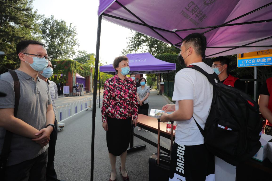 集中返校首日,校党委书记陈旭前往东北门了解当日自行返校同学的进校报到情况,看望了在校门负责引导工作的志愿者,并嘱咐志愿者同学们注意防暑。