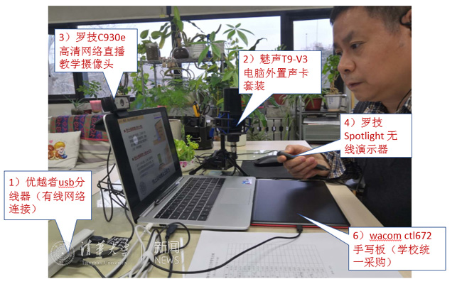 他摸索出了采用腾讯会议+雨课堂嵌套的方式进行讲课,还总结出一套硬件配置心得,包括带网线接口的USB扩展集线器、电脑外置声卡套装、高清网络直播教学摄像头,无线演示器和手写板,他把这套硬件方案分享给老师们,得到了众多好评。